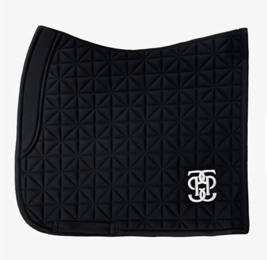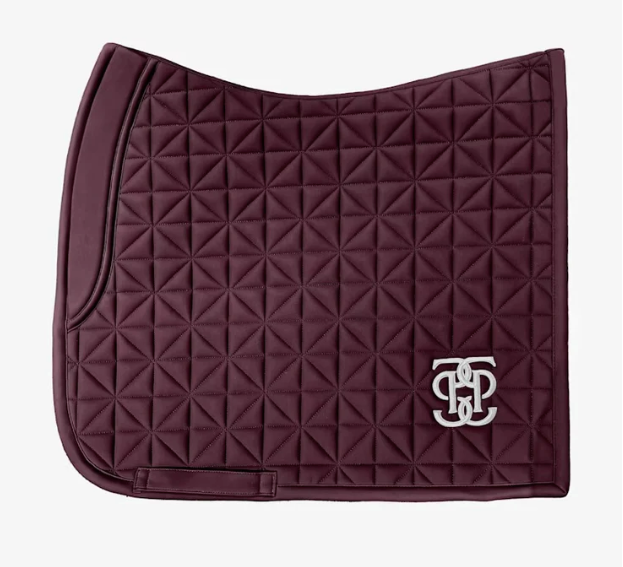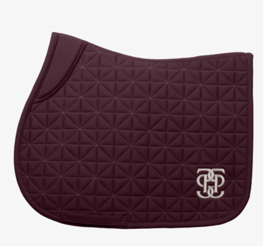 Diamond Quilt saddle pad in soft jersey with an anatomical spine shape for wither relief, pressure-relieving padding, Quick Dry lining, stop cushions, and breathable construction. Finished with a personalized quote along the spine and PS monogram embroidery.
